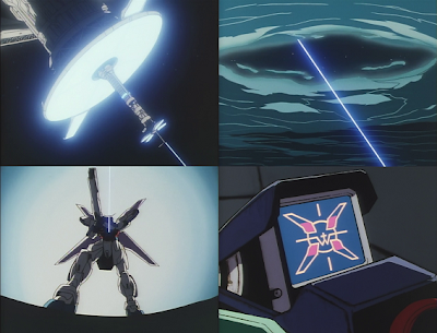 | Gundam X glows once the Satellite Cannon is charged, after the microwave beam is projected to it. |